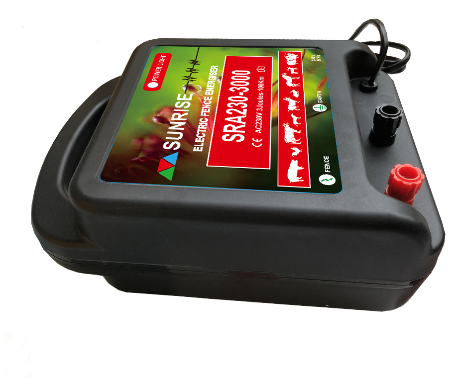 The SUNRISE SRA230-3000 energiser is a versatile electric fence energizer for fence lengths of up to 40 km! The unit produces a powerful 12,000V output, a great deterrent for stallions, bulls and other difficult to retain stock. The SUNRISE SRA230-3000 has efficient low power consumption in relation to its high pulse intensity.The energiser is designed to run off a 230/110/220 V power source, typically an automotive style battery that can be conveniently contained within the body of the unit and protected from the elements.